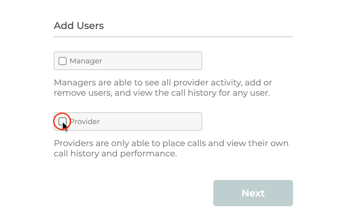 - Click “Add Users” from the side menu. If you do not see “Add Users” it means you are signed in with a Provider account.