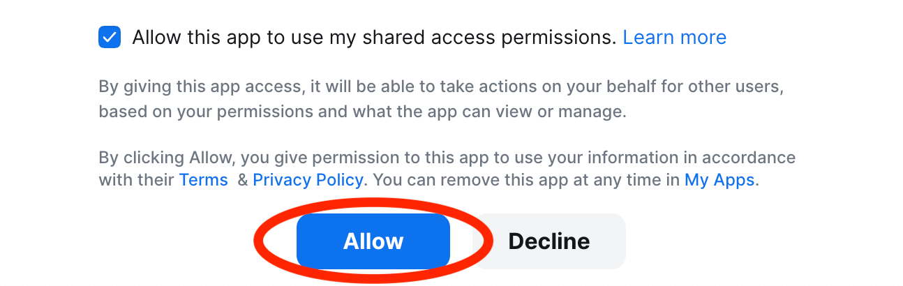 - Check the box that says “Allow this app to use my shared access permissions” (optional)
