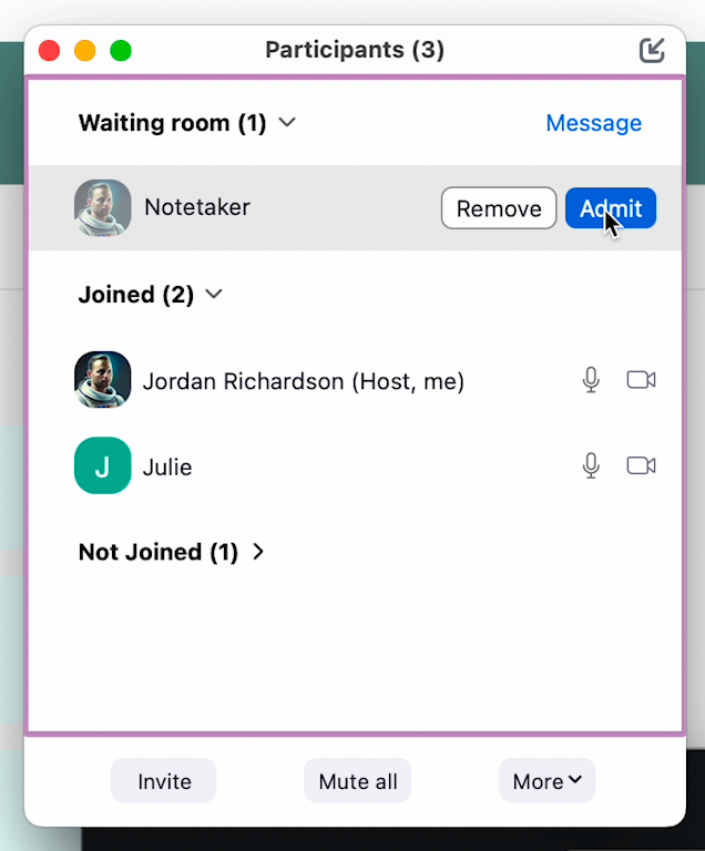 - Beside the “Notetaker” participant, click “More” again, then click “Put in waiting room”
